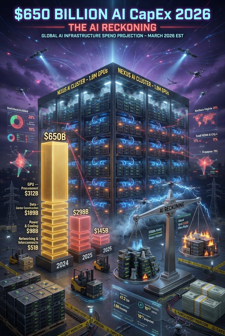 The hyperscalers are spending $650 billion annually in a cycle that looks less like industrial investment and more like supermarket restocking. Approximately 50% of planned US data center capacity is delayed or canceled — not because of chip scarcity alone, but because of electrical equipment shortages from Chinese supply chains. The building cannot be built because the power infrastructure to run it is unavailable.